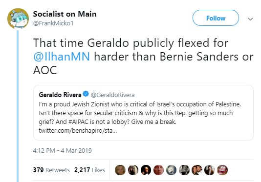 This cowardice in the face of manufactured outrage that Sanders claims is intended to stifle criticism is baffling. It has led to bizarre configurations of political alignment in which Geraldo Rivera is more outspoken in the defense of Omar than her own party colleagues, because he is unafraid to acknowledge the basic truthfulness of what she said.