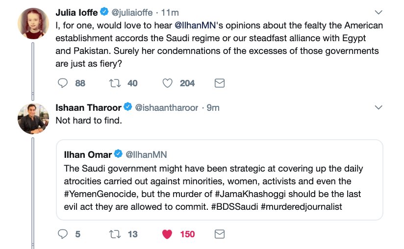 Or why would anyone assume genuine concern on the part of a journalist like Julia Ioffe who also could not help herself from getting outright racist about Omar by implying that she has not condemned nations such as Saudi Arabia- clear evidence to Ioffe that Omar is playing favorites and motivated by latent or intentional anti-Semitism. Just look at this exchange with a now-deleted tweet where Ioffe demonstrates just how lazy she is prepared to be while supposedly denouncing comments that she claims scare Jewish people, both liberal and conservative alike: