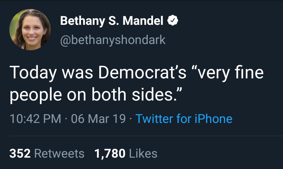 What she is referencing is President Trump’s words in response to the Charlottesville demonstrations where white supremacists of all stripes gathered in the streets to chant “Jews will not replace us” before James Fields’ premeditated attack by vehicle on activists led to the death of Heather Heyer. What she means to say is that Democrats not explicitly-but-instead-implicitly singling out Omar – who said and did nothing wrong, to be sure – is the same as actual terrorist violence.